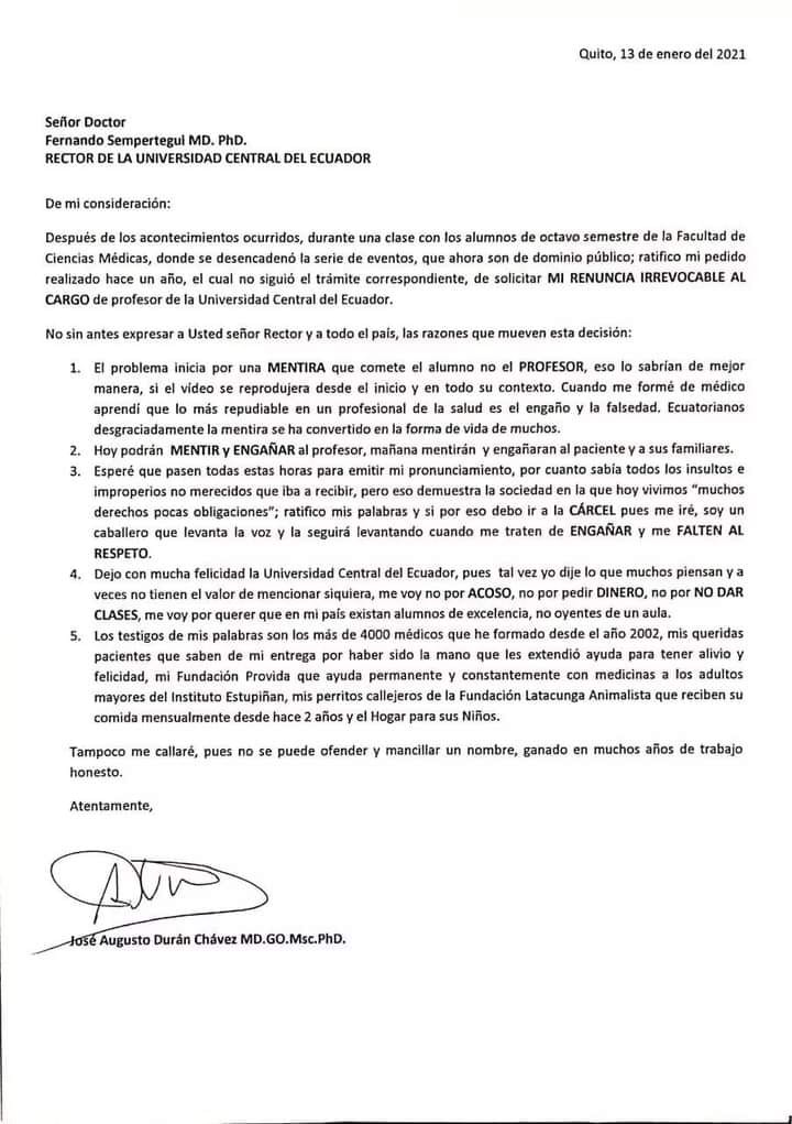 Por su parte, el docente José Augusto Durán Chávez, presentó la renuncia irrevocable a su cargo. Según el funcionario, «el problema inició por una mentira que cometió la alumna». Además, mencionó: «ratifico mis palabras y si por eso debo ir a la cárcel, pues me iré, soy un caballero que levanta la voz y la seguirá levantando cuando me traten de engañar y me falten al respeto». Lamentando su retiro de la universidad por querer, en el país, «alumnos de excelencia y no oyentes de un aula».